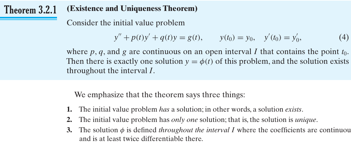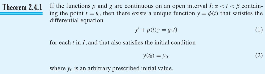 A unique solution to and initial value/conditions exists on some interval of denoted , if functions are continuous on for DE and contains initial point .